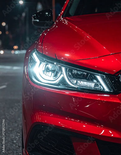car, red, headlamp, night, closeup, light, vehicle, automobile, modern, exterior, detail, night time, road, urban, illumination, glossy, design, technology, powerful, speed, luxury, automotive, detail, front, focused
