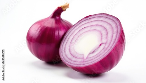 Close-up red onion half, showing layers, white backdrop, juicy, rings