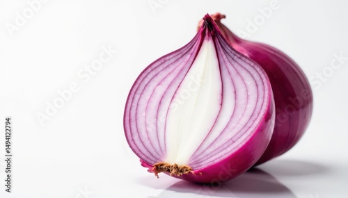 Close-up red onion half, showing layers, white backdrop, layers, cooking, botanical