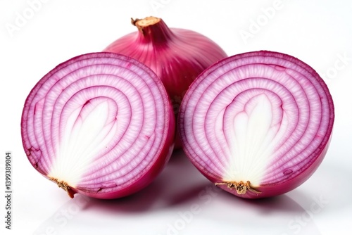 Close-up red onion halves, showing layers, pure white backdrop, macro, isolated, cross section