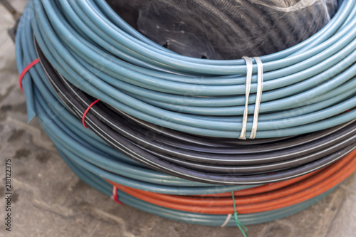Close-up shot for blue, black and orange colored cable wires
