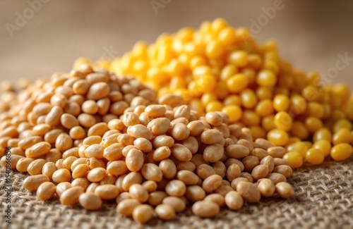 Close-up shot mixed soybean, wheat and corn seeds. Textured background of grains on burlap. Healthy raw organic food ingredient for nutrition. Agriculture products.