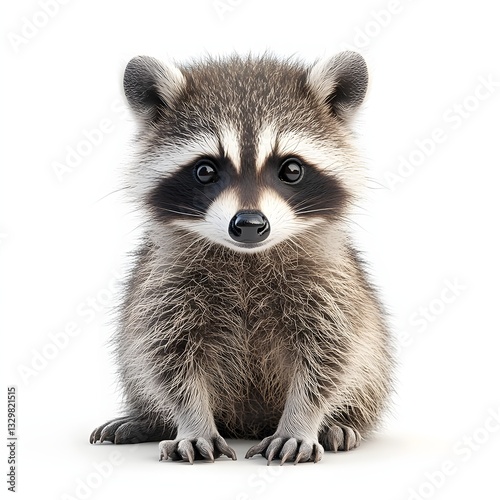 Close-up shot of a cute baby raccoon sitting against a white background. Adorable Raccoon