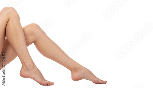 Close-up shot of a pair of smooth, hairless legs and feet against a stark white background