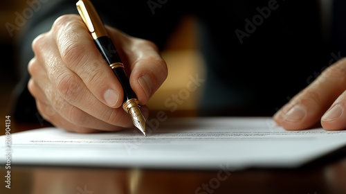 Close-up shot of a person signing a document with a elegant fountain pen on a wooden surface, illustrating professionalism and important decisions