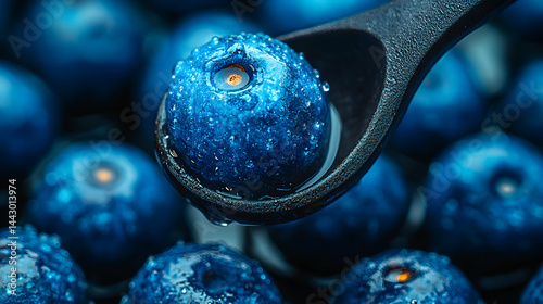 Close-up shot of a single, juicy blueberry on a dark spoon, surrounded by other blueberries; water droplets enhance the vibrant blue hue.