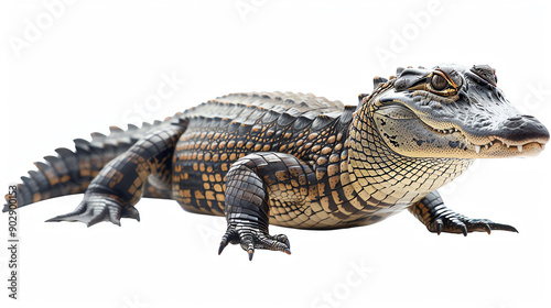 Close-up shot of a young alligator on a white background, showcasing its detailed scales and sharp eyes.