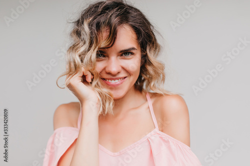 Close-up shot of amazing girl with tanned skin laughing to camera. Studio portrait of glad caucasian lady in pink dress.