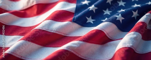Close-up shot of an American flag's fabric with waves and ripples moving in the breeze, stripe pattern, color palette, star design