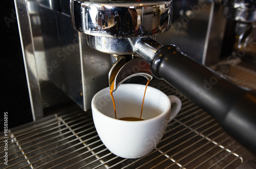 Closeup shot of an espresso maker pouring coffee into a cup inside of a cafe.
