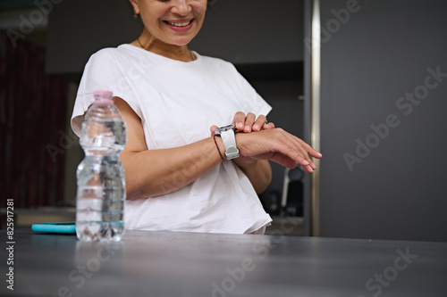 Close-up shot of hands of a smiling heathy young woman checking smart wrist watch. A bottle of pure water on the foreground. Fitness app, mobile app. People. Health care and modern wireless technology