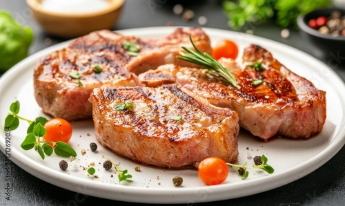 meat, fillet, food, grill, beef, steak, roast, cooked, meal, sirloin, beefsteak, cutlet, pork meat, portion, bar-b-q, dining, tomatoes, plate, rosemary, background, dinner, chop, vegetable, lunch, close, up, shot, white
