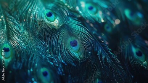 close-up shot of peacock feathers, each one displaying the beautiful gradient of colors from deep blue to emerald green