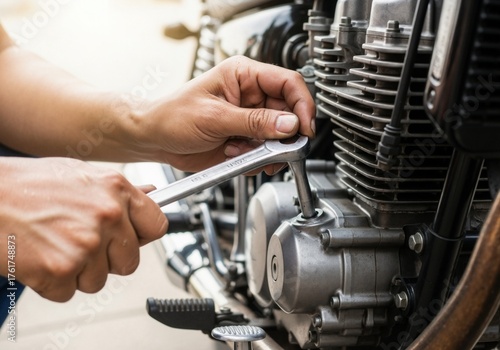 motorcycle, wrench, mechanic, hand, closeup, person, repair, engine, mechanical, service, fix, vehicle, motorbike, maintenance, metal, tool, industry, equipment, skill, work, professional, expert, technician, engineering, craftsmanship, assembly, adjustment, detailed, precision, inspection, exam, analysis, evaluation, restoration, rebuild, improvement, upgrade, optimization, customization