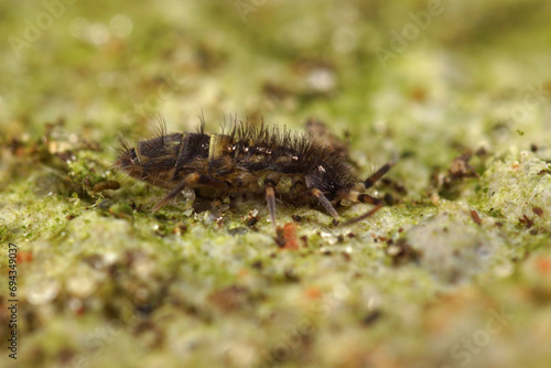 Close-up shot of the common belted springtail Orchesella cincta on wood in the garden