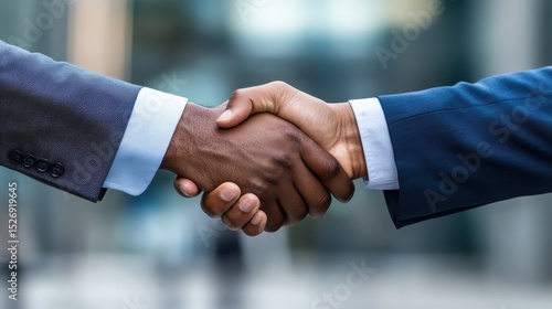 Close-up shot of two diverse businessmen shaking hands, signifying a successful business deal or partnership agreement. The image conveys trust, collaboration, and mutual respect. : Generative AI