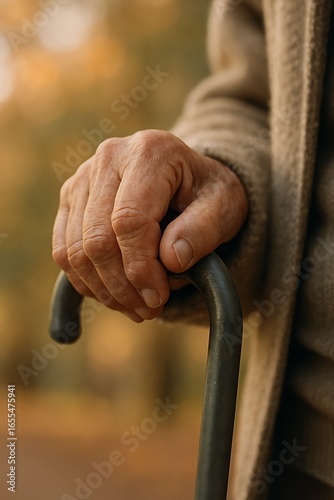 senior, elderly, hand, cane, grip, stability, support, assistance, mobility, aid, age, ageing, mature, adult, well-being, health, health care, lifestyle, active, outdoors, autumn, fall, season, warm, blurred background, soft focus, texture, detail, closeup, old age, retirement, confidence, independence, determination, strength, coping, life, life events, wisdom, resilience, challenge, adaptation, care, comfort, security, longevity, well-being