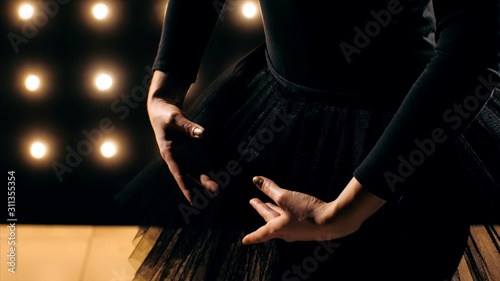 Close-up silhouette of ballerina in black dress is standing in ballet dancing pose. Hands close-up in dark studio with the lights on the background.