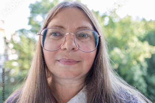 close-up stylish charismatic mature woman wearing glasses with long brown hair, age-related changes, smiling confidently, positivity and enthusiasm, positive energy