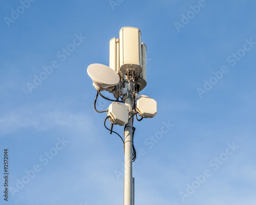 Closeup telecommunications tower with beautiful blue sky backgro
