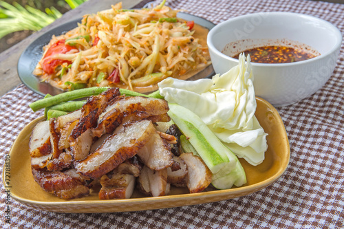 Closeup Thai papaya salad serve with vegetables, popular thailand
