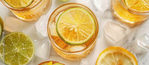 Close-up top view of a refreshing lemon iced tea with lime slices on a plain background, perfect for a copy space image.