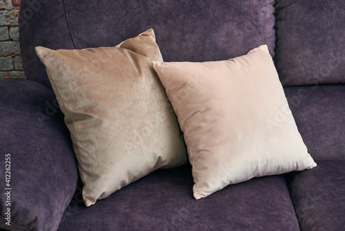 Closeup two beige pillows lie on corner of beautiful purple sofa made of modern material. Concept of home comfort.