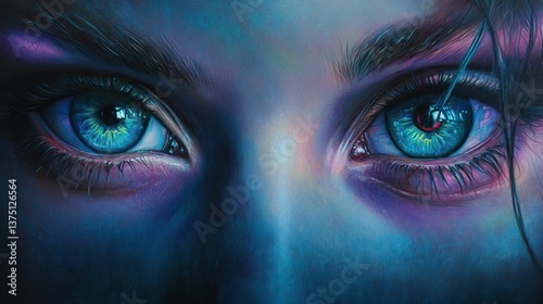 Close-up, vibrant, blue eyes, intense gaze, painted detail.