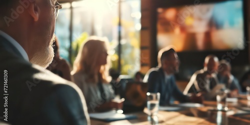 Close-up view corporate business team and their manager engaged in a focused meeting. The background features a blurred.