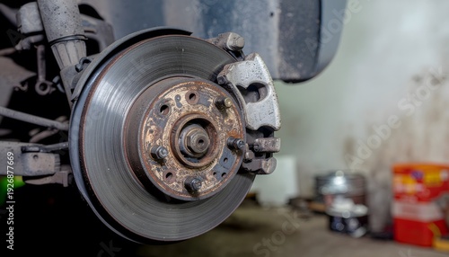 Close-up view of a car's brake rotor and caliper assembly during maintenance or repair, highlighting mechanical components