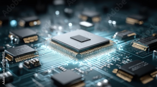 Close-up view of a central processing unit chip on a complex circuit board, highlighting intricate details and glowing pathways.