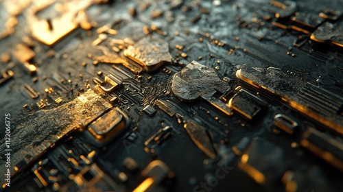 Close-up view of a circuit board with gold and dark elements, showcasing intricate details and a futuristic aesthetic. The warm light highlights the metallic texture.