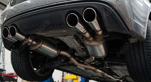 car, exhaust, system, quad, pipe, silver, aftermarket, modification, auto, repair, shop, closeup, detail, craftsmanship, metallic, chrome, stainless steel, muffler, undercarriage, vehicle, automobile, automotive, engineering, mechanic, tuning, performance, upgrade, custom, luxury, speed, power, technology, maintenance, service, garage, workshop, tire, wheel, suspension, part, component, metal, steel, machinery
