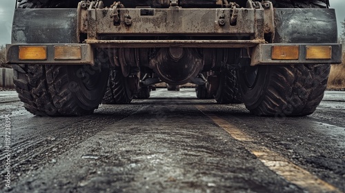 truck, tire, wheel, axle, undercarriage, vehicle, transport, transportation, road, asphalt, dirty, mud, grunge, heavy, machinery, industrial, cargo, delivery, logistic, driving, travel, journey, engine, mechanic, automotive, engineering, technology, powerful, strong, rugged, hard-wearing, metal, steel, rubber, suspension, chassis, rear, view, perspective, low, ground, surface, texture, detail, image, photo, picture, background
