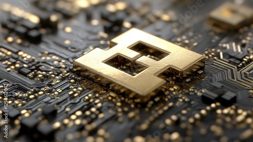 Close-up view of a golden circuit board design featuring intricate electronic components