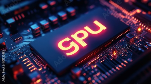Close-up view of a GPU on a circuit board with glowing details