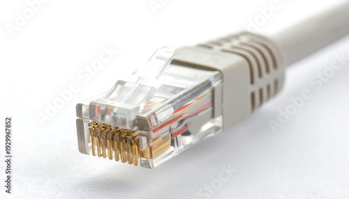 Close-up view of a grey Ethernet cable connector with clear plastic housing and gold-plated pins on a white background, highlighting network connectivity.