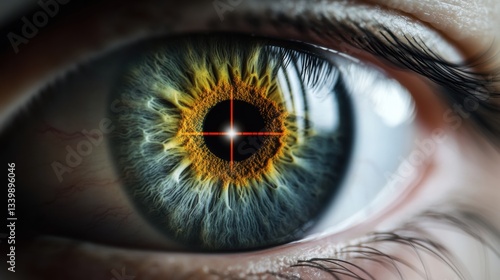Close-up View of a Human Eye with a Futuristic and Intriguing Design Featuring a Colorful Iris and Target Crosshair Overlay