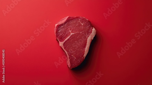 Close-up view of a marbled raw beef steak against a vibrant red backdrop highlighting its freshness and rich color.