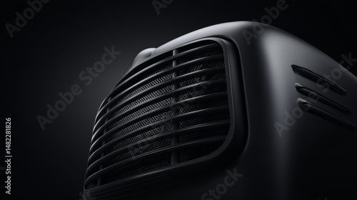 Close-up view of a modern black air fan against dark background.