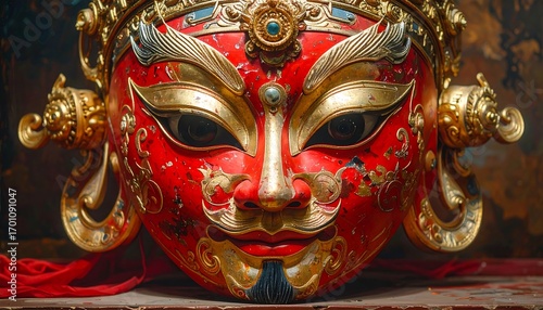 Close-up view of a richly detailed, ornate red mask, adorned with gold embellishments and intricate patterns, displaying a dramatic and symbolic facial expression.