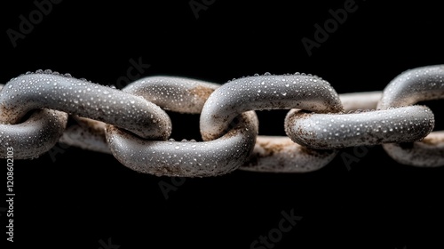 Close-Up View of a Rusty Steel Chain with Water Droplets on a Black Background Highlighting Texture and Detail for Industrial and Abstract Themes