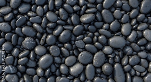 Close-up view of a textured surface composed of numerous smooth, dark gray pebbles, showcasing variations in shade and subtle markings.