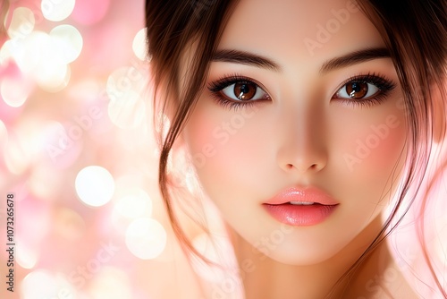 copy space, skin, smooth, care, treatment, model, woman, female, young, beauty, portrait, radiant, large, eye, soft, lip, elegance, mesmerizing, captivating, make-up, expressive, feature, dreamy, background, glamour, glowing, facial, expression, charming, allure, serenity, fashion, style, feminine, aesthetic, visage, tone, visual, art, lighting, colours, delicate, joyful, serene, coiffure, trend, attractiveness, chic, confidence