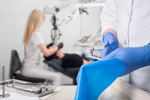 Close-up view of assistant's hands with blue gloves working with dental equipment, on the blurred background dentist is treating patient in dental office. Dentistry