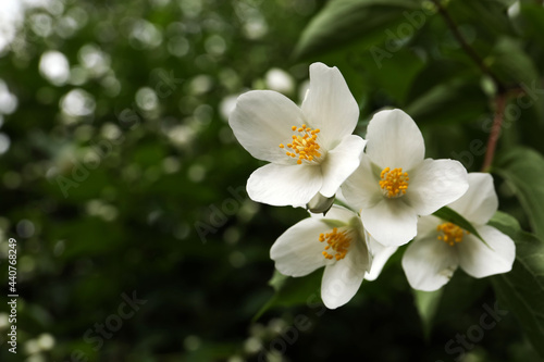 Closeup view of beautiful jasmine flowers outdoors. Space for text
