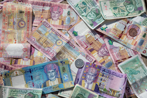 Closeup view of different banknotes and coins of omani rials