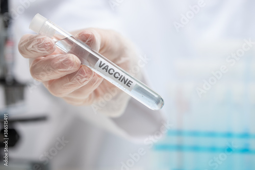 Close-up view of doctor, nurse or laboratory assistant hand in protective gloves keeps biological tube with covid-19 vaccine. Healthcare And Medical concept. Pandemic Corona Virus.