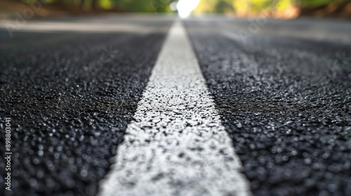 Close-up view of freshly poured asphalt with a bright white road marking, emphasizing texture and detail. Ideal for themes of construction, road maintenance, and infrastructure.