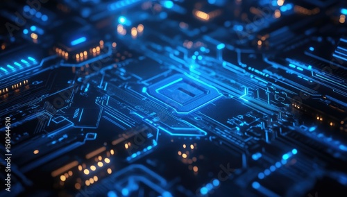 circuit, board, processor, technology, digital, electronic, glowing, blue, light, trace, line, connection, microchip, integrated, circuitry, component, innovation, future, design, detail, complex, pattern, engineering, modern, high technology, system, graphic, rendering, three-dimensional, image, bright, dark, metal, chips, energy, electrical, power, computer, processing, datum, speed, performance, advanced